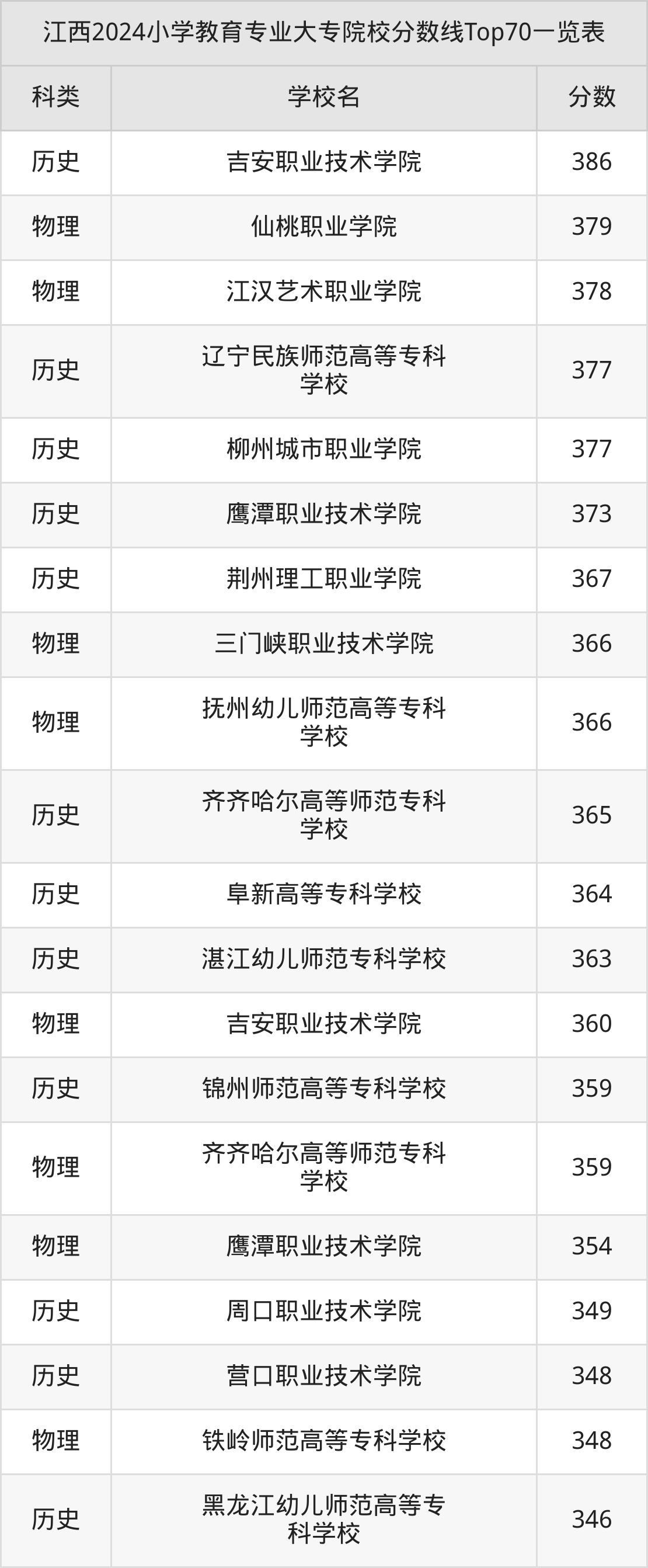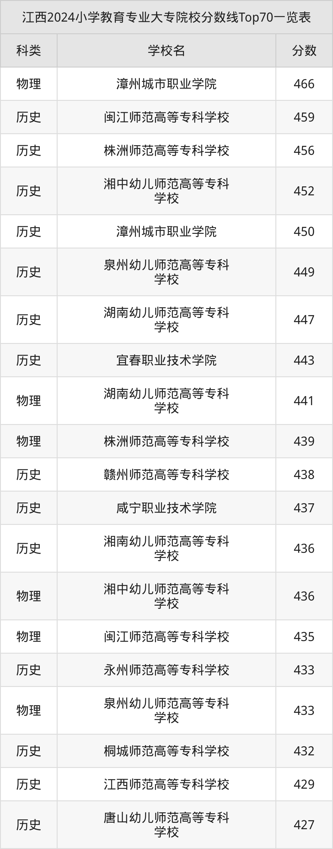 物理类最低收分范围在247分~466分之间,其中最低分院校是巴中职业技术学院,最高分院校是漳州城市职业学院。结合上述分析,物理类考生比历史类考生更容易上小学教育大专院校。