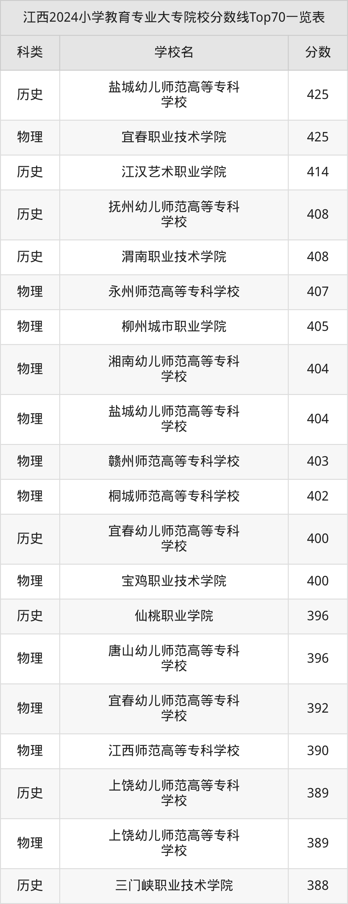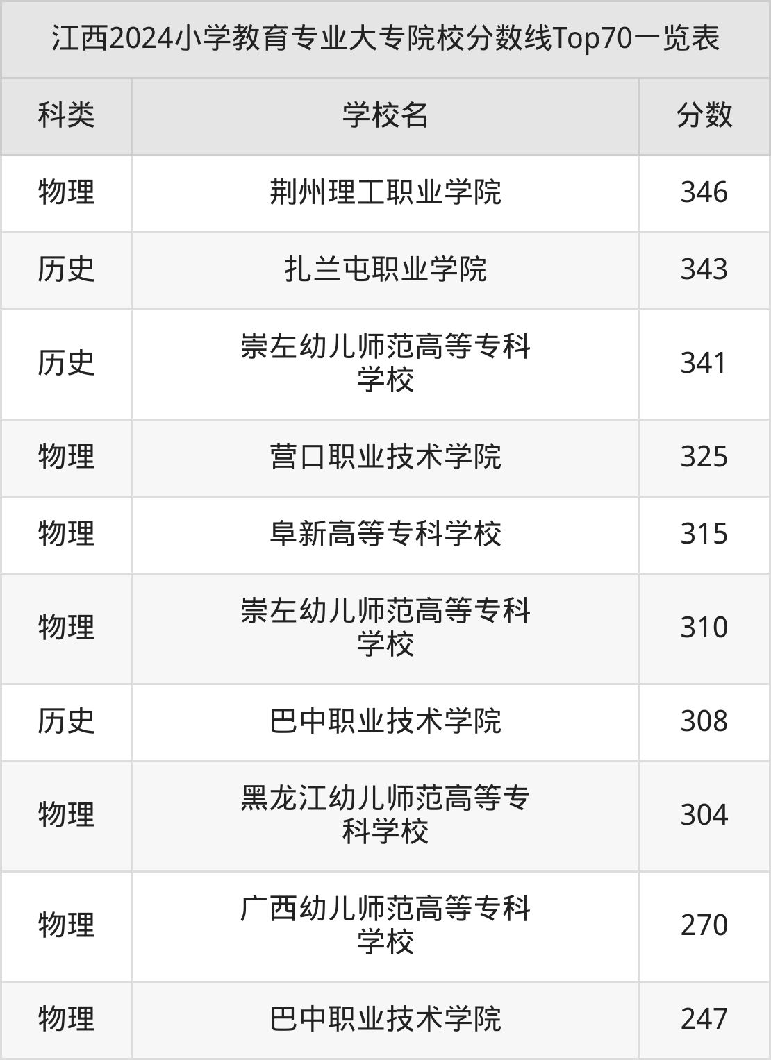 小学教育专业大专院校实力排名靠前的有金华职业技术学院、湖南民族职业学院、襄阳职业技术学院等。2024年大专小学教育专业招生最低分数为247分(物理类),而想报考该专业的历史类考生分数至少要在308分以上。