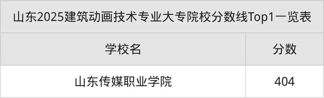 全国大专院校建筑动画技术专业最低收分为404分,对应的招生院校是山东传媒职业学院。