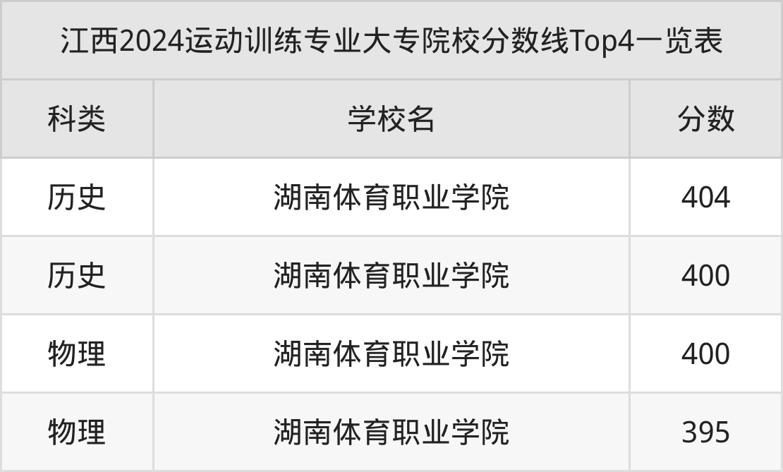 全国大专院校运动训练专业历史类最低收分范围在400分~404分之间,考生最容易被录取的是湖南体育职业学院,分数门槛在专科线上130分。最难被录取的是湖南体育职业学院,分数门槛在专科线上134分。
