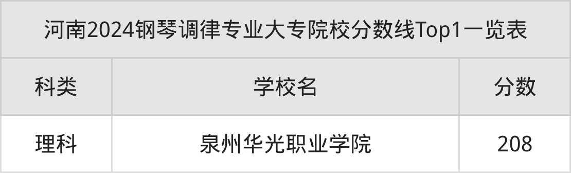 全国大专院校钢琴调律专业理科最低收分为208分,对应的招生院校是泉州华光职业学院。