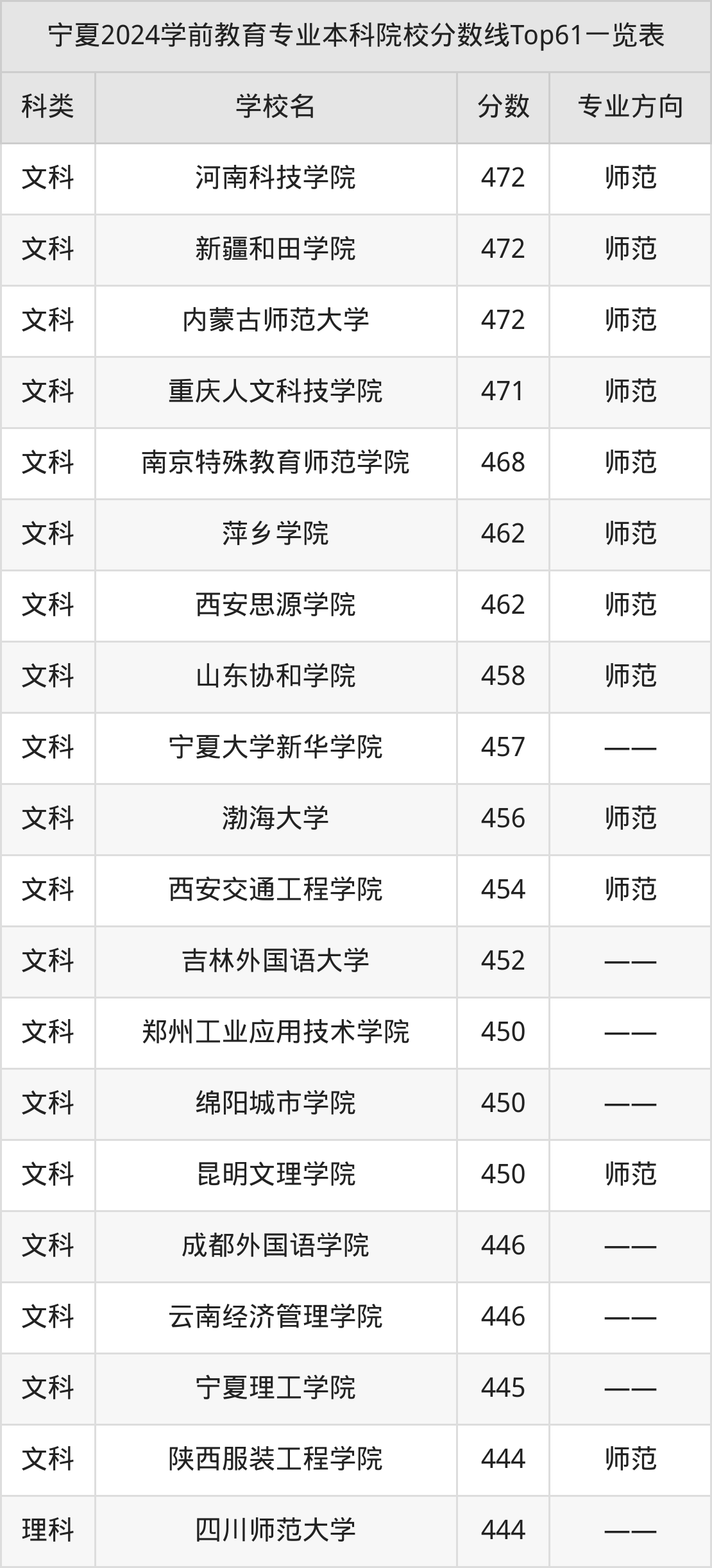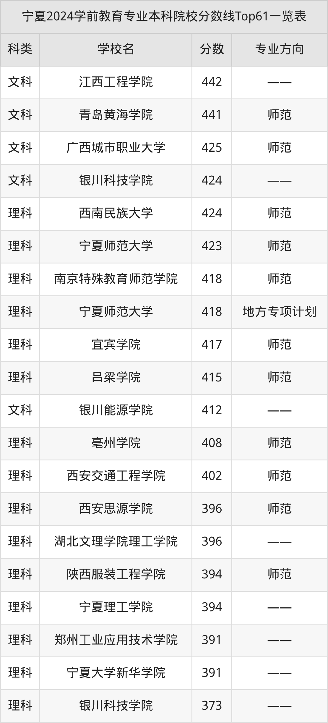 理科最低收分范围在362分~444分之间,其中最低分院校是银川能源学院,最高分院校是四川师范大学。结合上述分析,理科考生比文科考生更容易上学前教育本科院校。