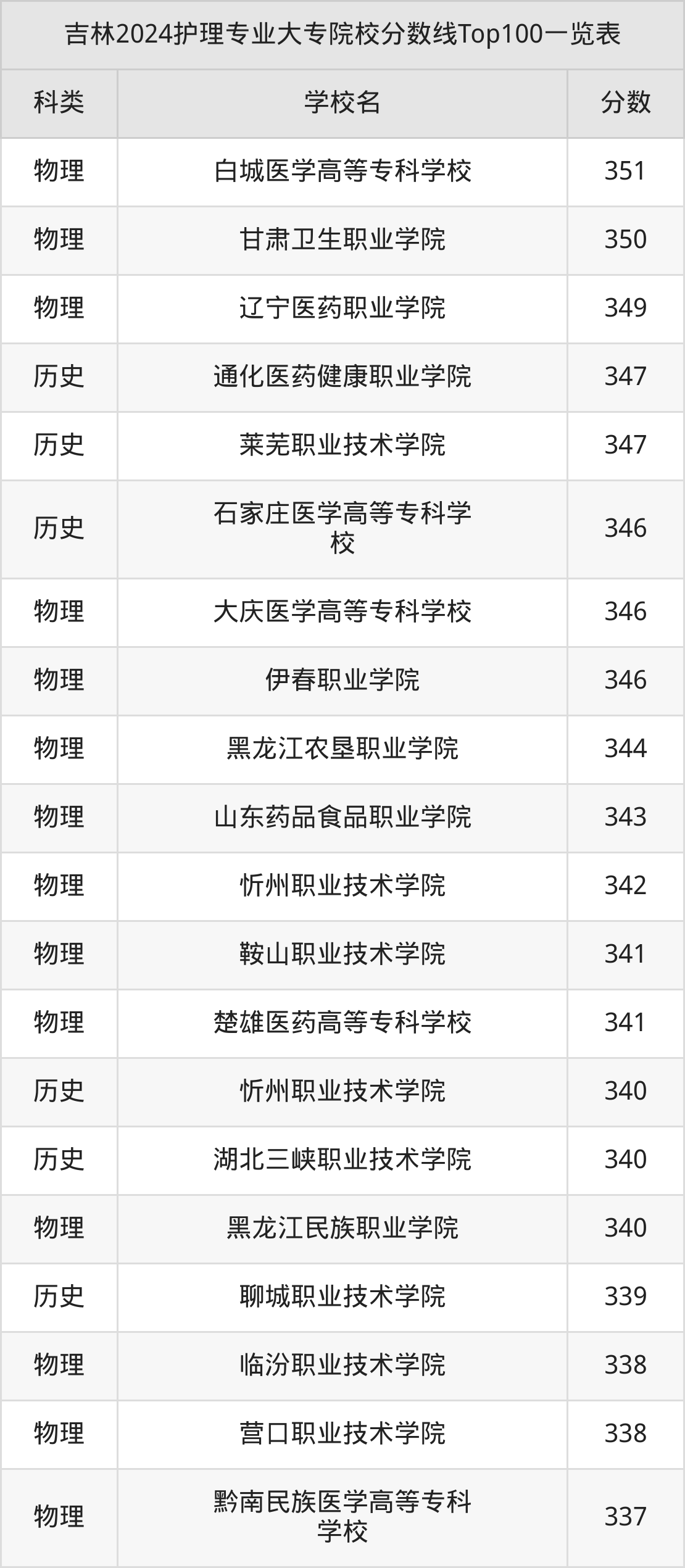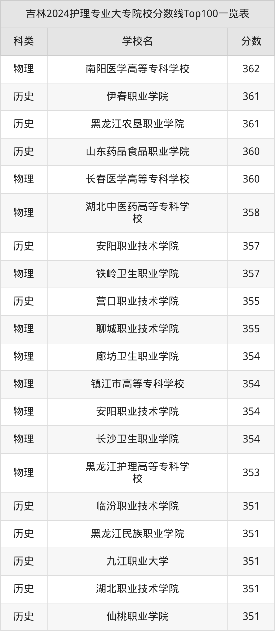 物理类最低收分范围在174分~412分之间,其中最低分院校是长春信息技术职业学院,最高分院校是山东医学高等专科学校。结合上述分析,历史类考生比物理类考生更容易上护理大专院校。