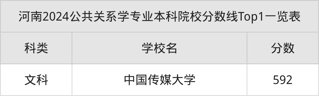 全国本科院校公共关系学专业文科最低收分为592分,对应的招生院校是中国传媒大学。