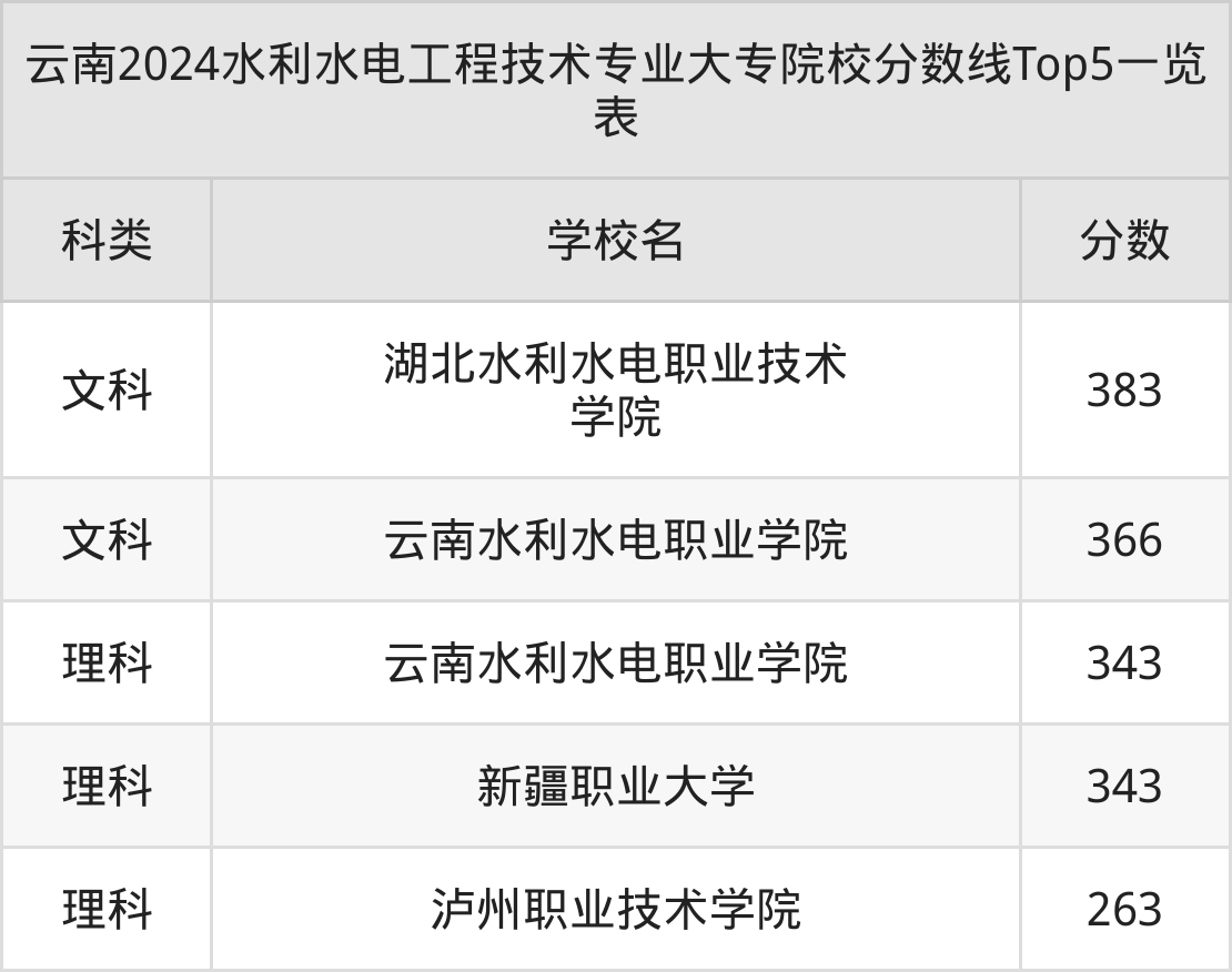 理科最低收分范围在263分~343分之间,其中最低分院校是泸州职业技术学院,最高分院校是云南水利水电职业学院。结合上述分析,理科考生比文科考生更容易上水利水电工程技术大专院校。