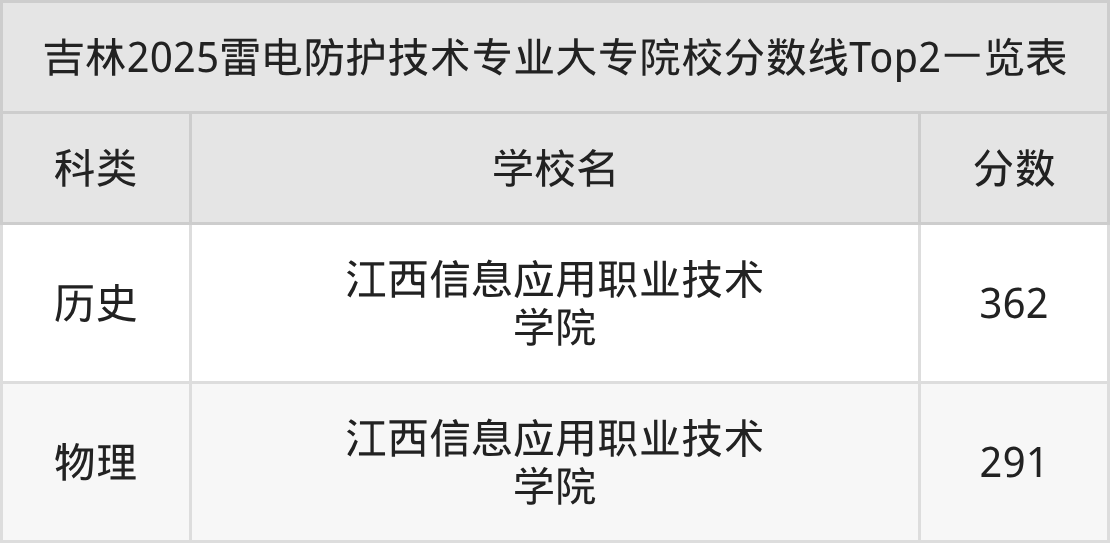 全国大专院校雷电防护技术专业历史类最低收分为362分,对应的招生院校是江西信息应用职业技术学院。