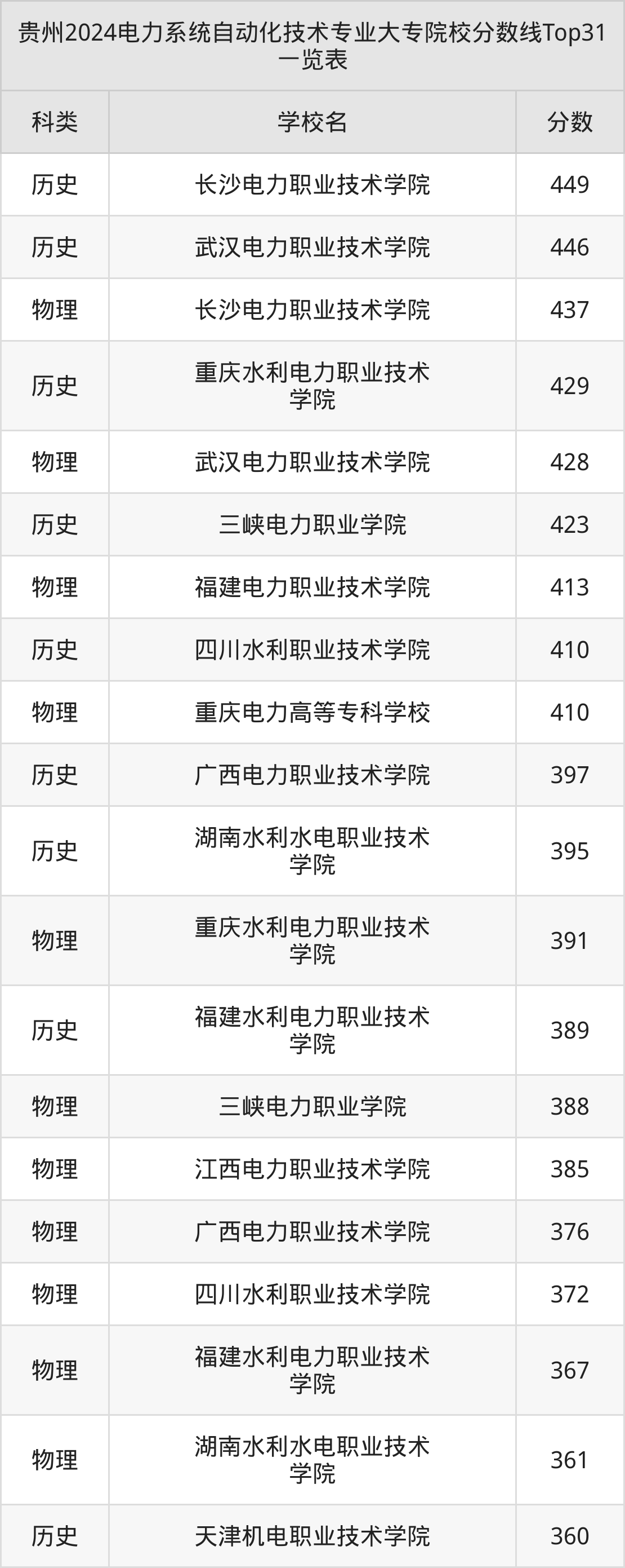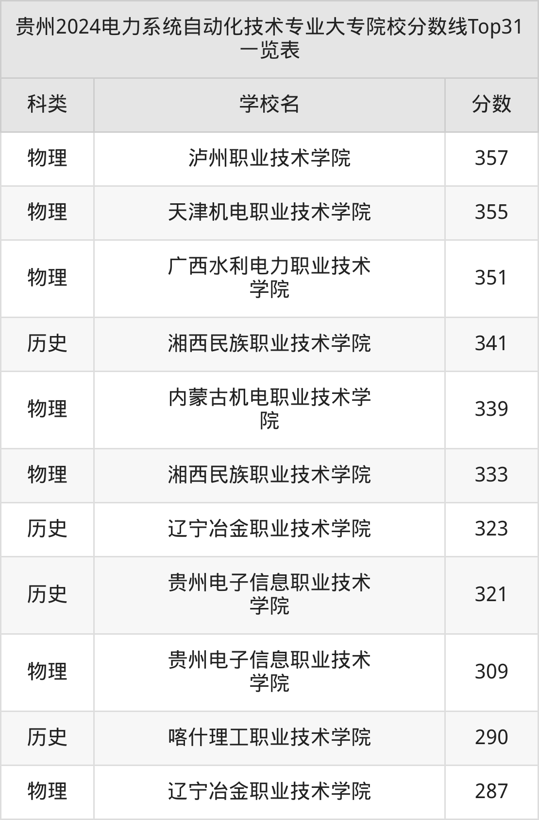 电力系统自动化技术专业大专院校实力排名靠前的有内蒙古机电职业技术学院、武汉电力职业技术学院、广西电力职业技术学院等。2024年大专电力系统自动化技术专业招生最低分数为287分(物理类),而想报考该专业的历史类考生分数至少要在290分以上。