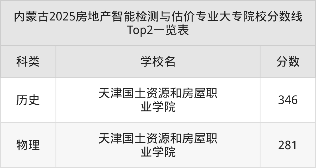 全国大专院校房地产智能检测与估价专业历史类最低收分为346分,对应的招生院校是天津国土资源和房屋职业学院。