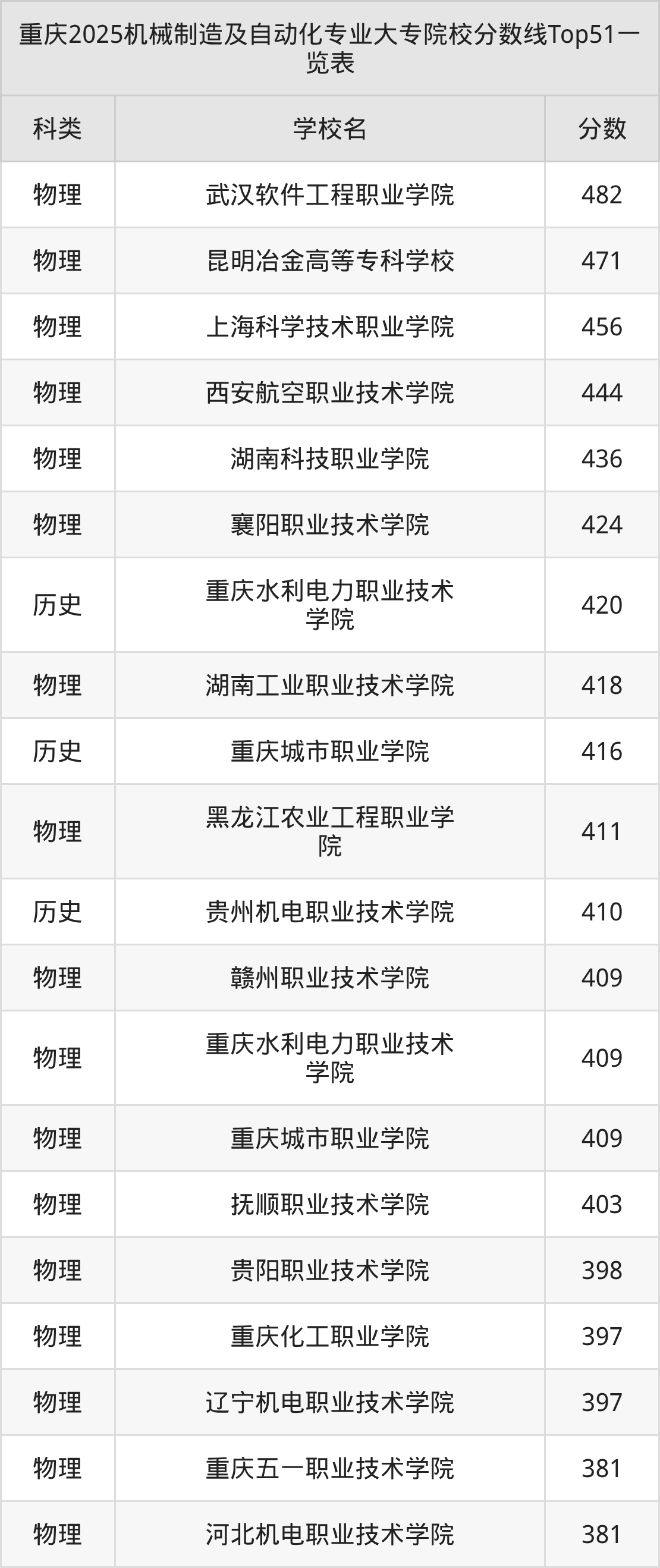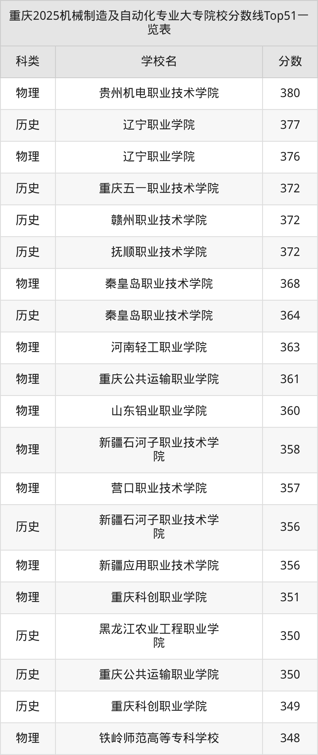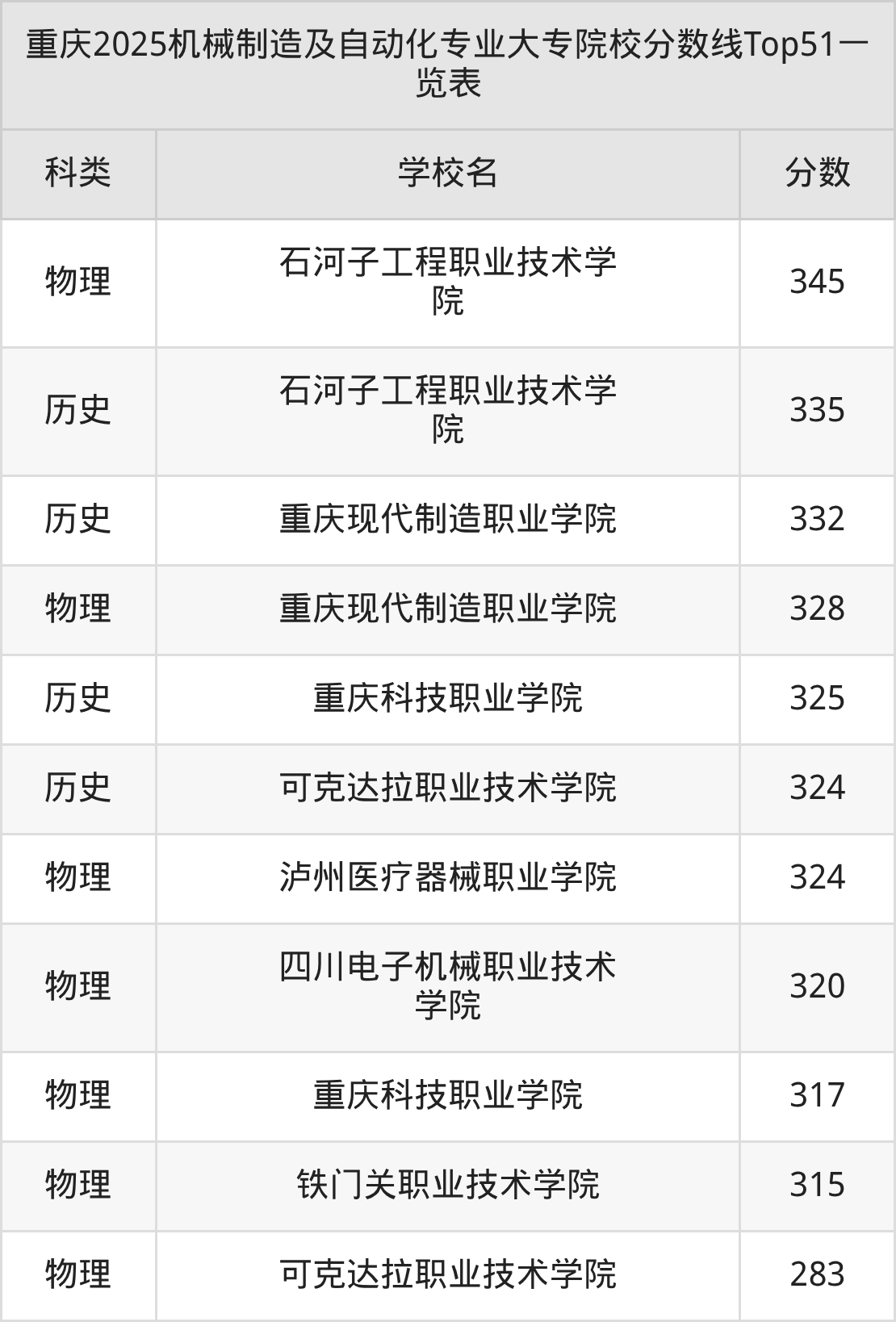 机械制造及自动化专业大专院校实力排名靠前的有陕西工业职业技术学院、金华职业技术大学、无锡职业技术学院等。2025年大专机械制造及自动化专业招生最低分数为283分(物理类),而想报考该专业的历史类考生分数至少要在324分以上。