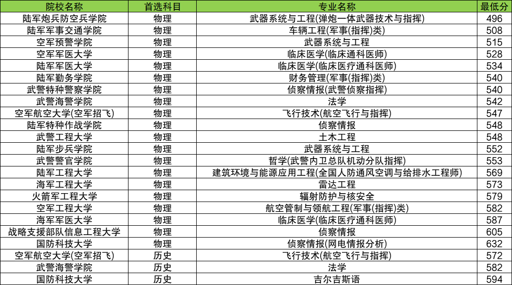 物理类招生分数均在496分及以上,最高分为670分(国防科技大学),对应招生专业为计算机科学与技术;最低分为496分(陆军炮兵防空兵学院),对应招生专业为武器系统与工程(弹炮一体武器技术与指挥);