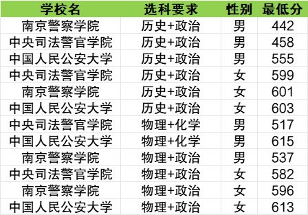 历史类招生分数均在442分及以上,女生最低分为599分(中央司法警官学院);男生最低分为442分(南京警察学院)。