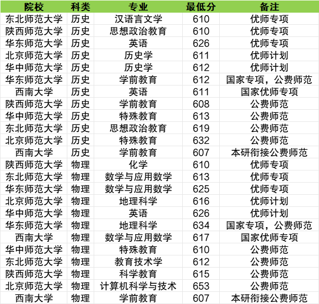 历史类招生分数均在607分及以上,最低分院校为西南大学(607分),对应最低分招生专业为学前教育;