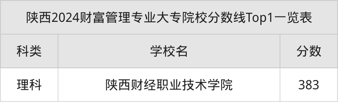 全国大专院校财富管理专业理科最低收分为383分,对应的招生院校是陕西财经职业技术学院。