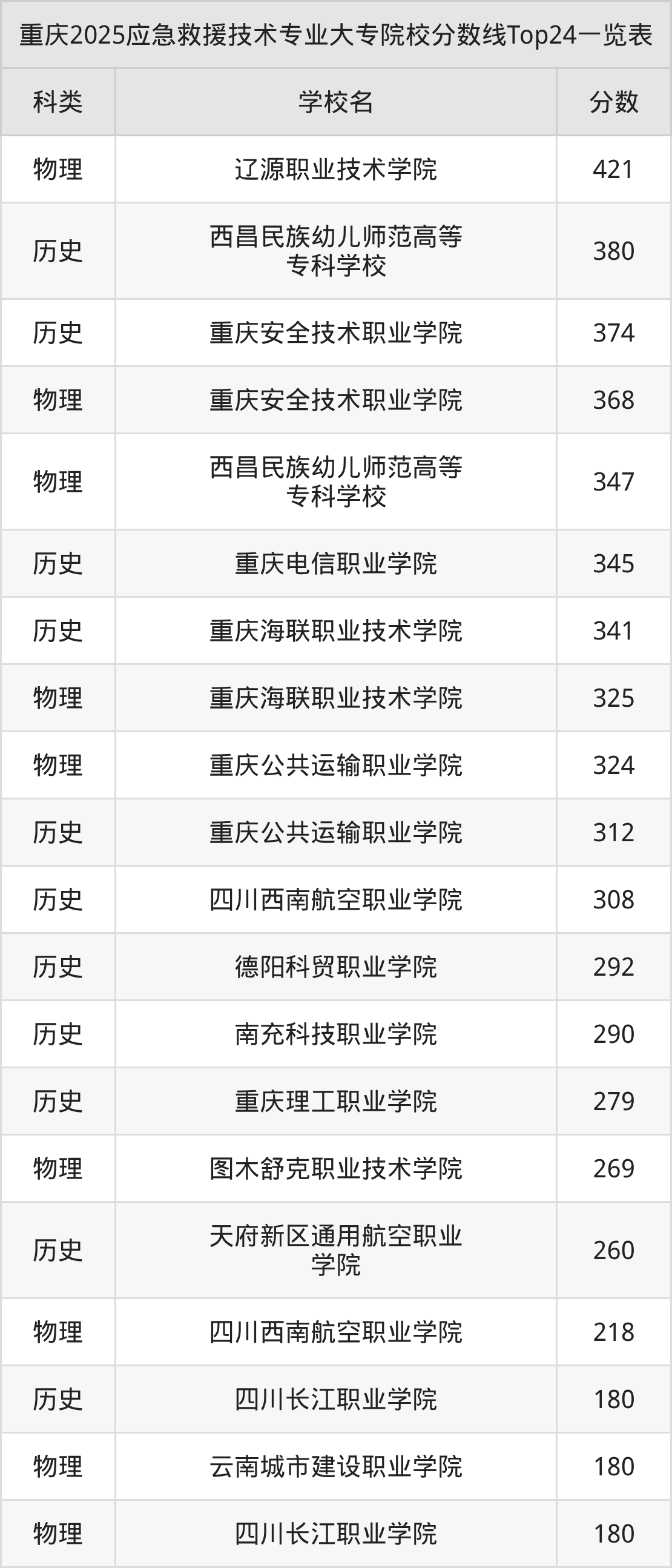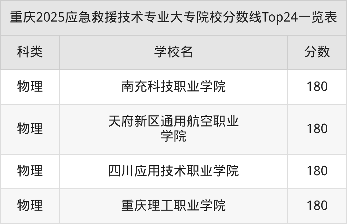 物理类最低收分范围在180分~421分之间,其中最低分院校是云南城市建设职业学院,最高分院校是辽源职业技术学院。历史类、物理类考生上应急救援技术大专院校的难度是一样的。