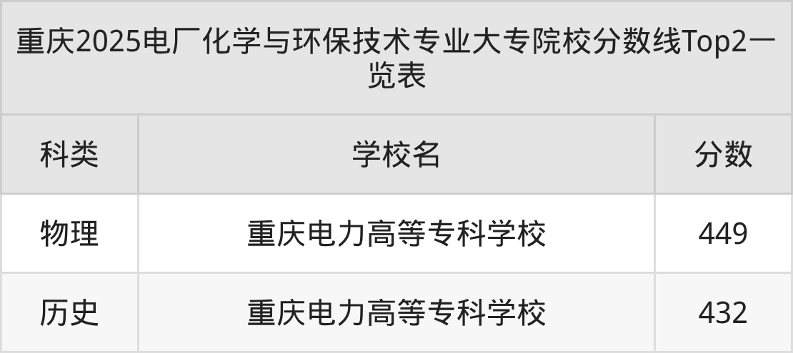 物理类最低收分为449分,对应的招生院校是重庆电力高等专科学校。结合上述分析,历史类考生比物理类考生更容易上电厂化学与环保技术大专院校。