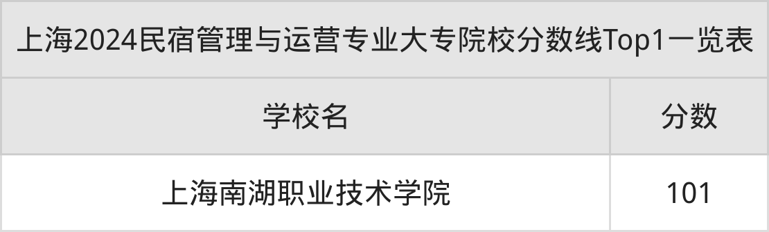 全国大专院校民宿管理与运营专业最低收分为101分,对应的招生院校是上海南湖职业技术学院。