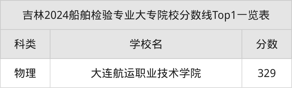 全国大专院校船舶检验专业物理类最低收分为329分,对应的招生院校是大连航运职业技术学院。