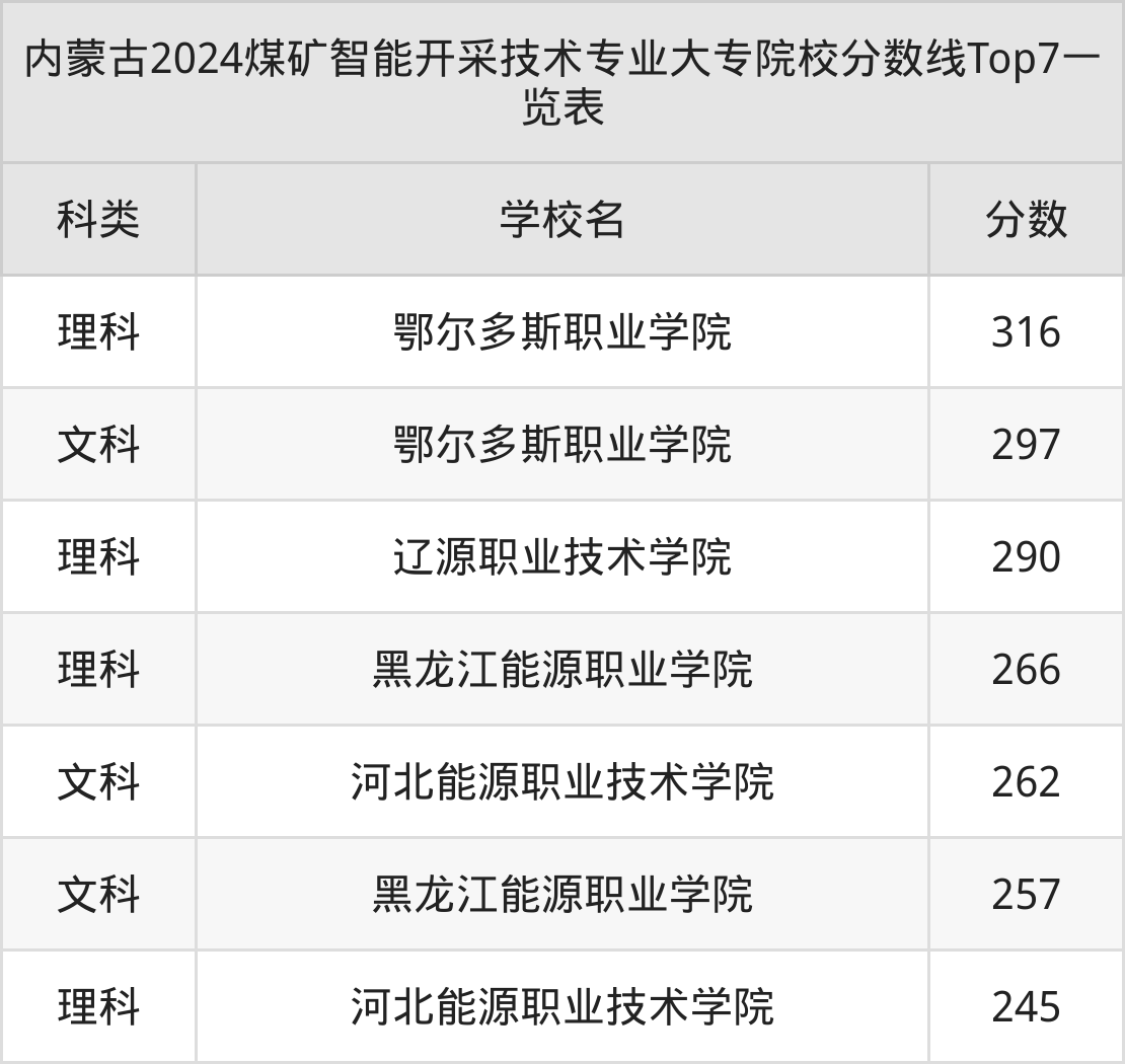 全国大专院校煤矿智能开采技术专业文科最低收分范围在257分~297分之间,考生最容易被录取的是黑龙江能源职业学院,分数门槛在专科线上97分。最难被录取的是鄂尔多斯职业学院,分数门槛在专科线上137分。