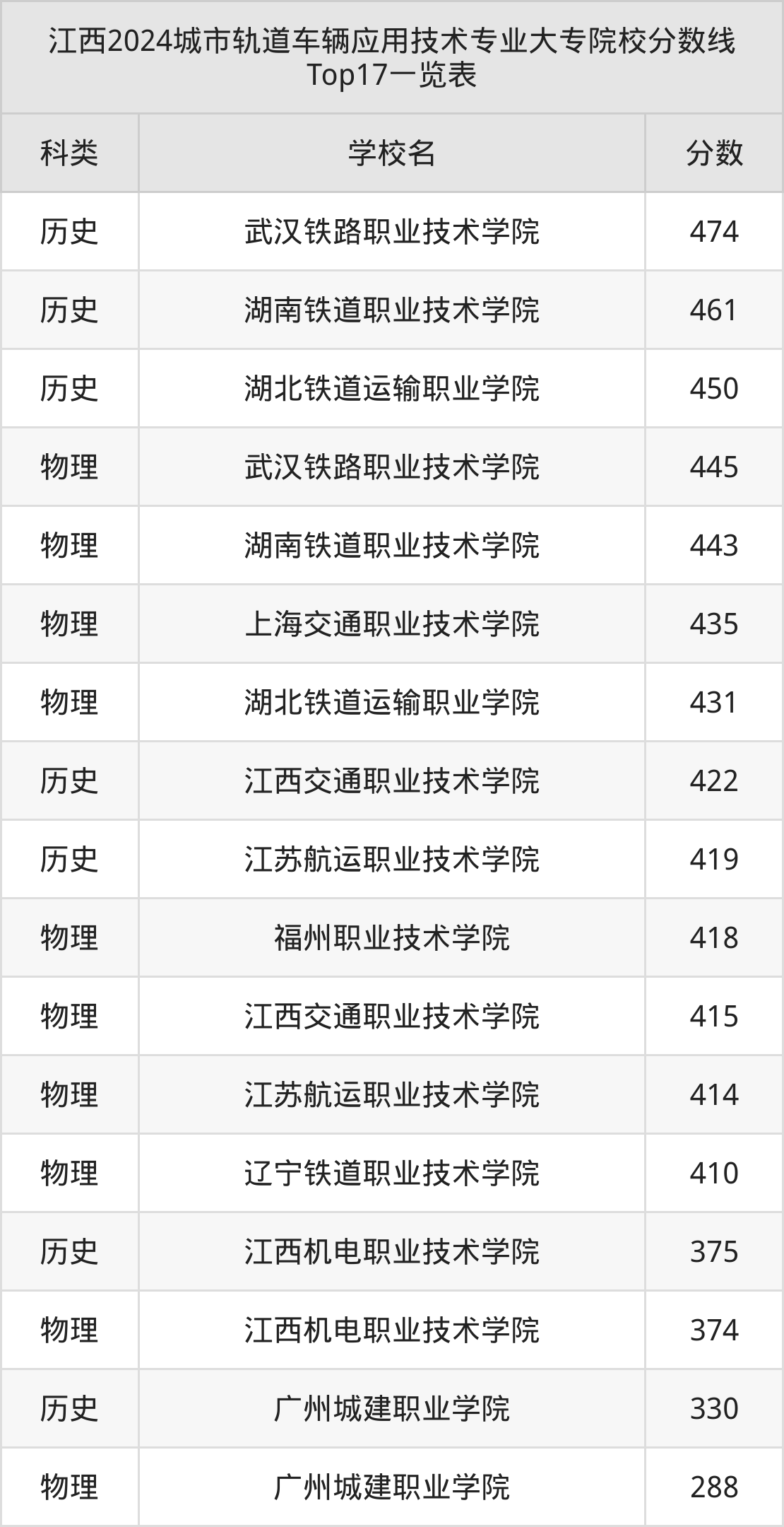 全国大专院校城市轨道车辆应用技术专业历史类最低收分范围在330分~474分之间,考生最容易被录取的是广州城建职业学院,分数门槛在专科线上60分。最难被录取的是武汉铁路职业技术学院,分数门槛在专科线上204分。