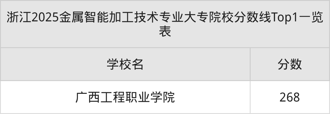 全国大专院校金属智能加工技术专业最低收分为268分,对应的招生院校是广西工程职业学院。