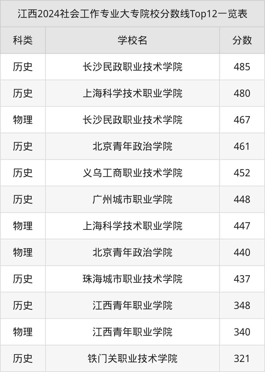 物理类最低收分范围在340分~467分之间,其中最低分院校是江西青年职业学院,最高分院校是长沙民政职业技术学院。结合上述分析,历史类考生比物理类考生更容易上社会工作大专院校。