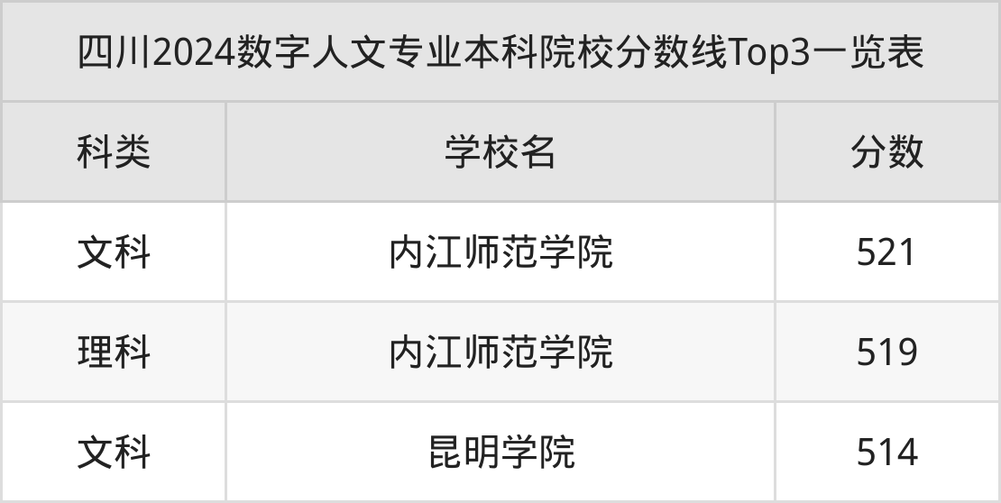 理科最低收分为519分,对应的招生院校是内江师范学院。结合上述分析,文科考生比理科考生更容易上数字人文本科院校。