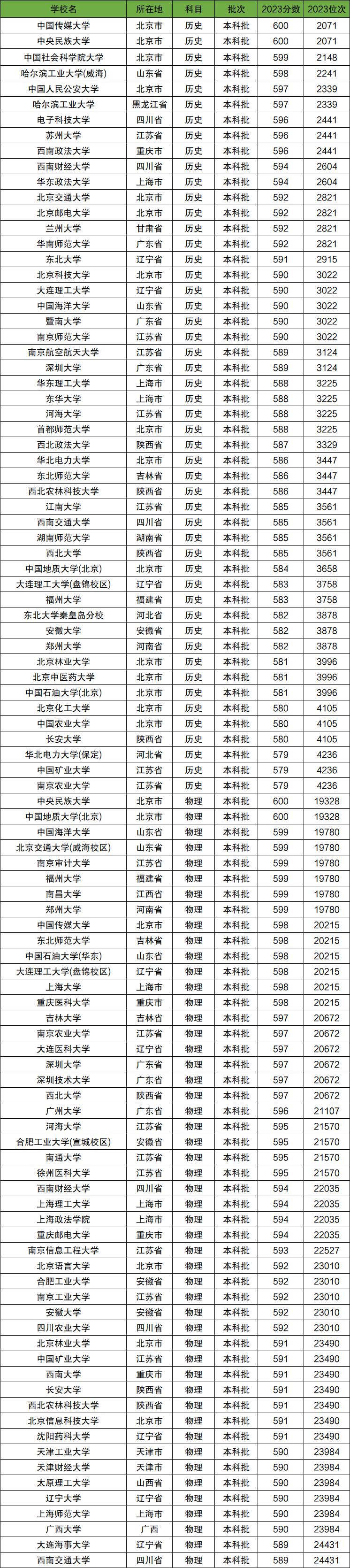 历史类共计181所,物理类共计223所,本文篇幅有限,上表只列举100所大学。