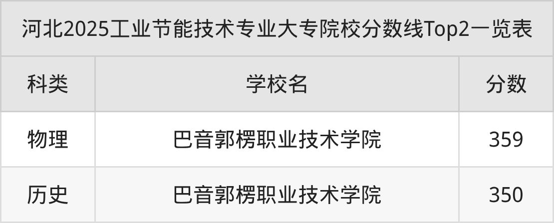 物理类最低收分为359分,对应的招生院校是巴音郭楞职业技术学院。结合上述分析,历史类考生比物理类考生更容易上工业节能技术大专院校。