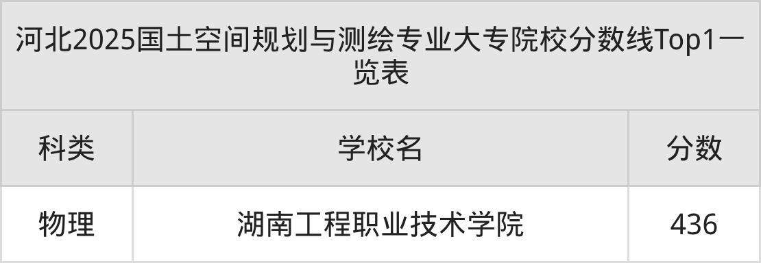 全国大专院校国土空间规划与测绘专业物理类最低收分为436分,对应的招生院校是湖南工程职业技术学院。