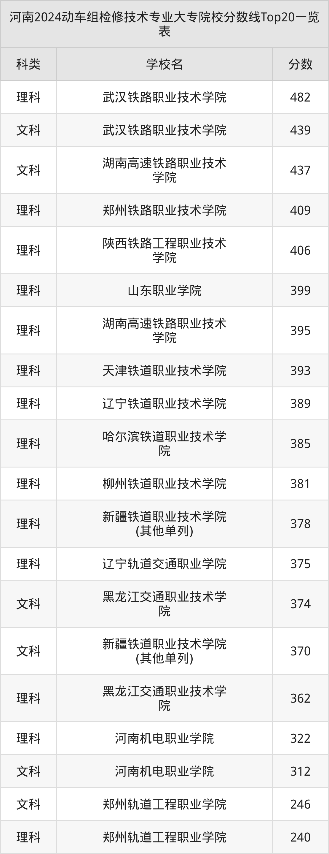 理科最低收分范围在240分~482分之间,其中最低分院校是郑州轨道工程职业学院,最高分院校是武汉铁路职业技术学院。结合上述分析,理科考生比文科考生更容易上动车组检修技术大专院校。