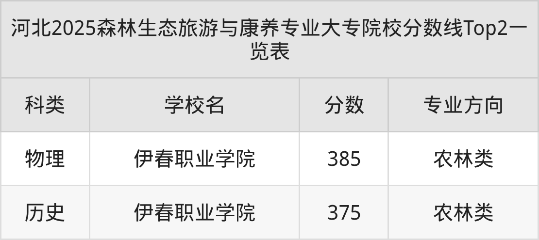 物理类最低收分为385分,对应的招生院校是伊春职业学院。结合上述分析,历史类考生比物理类考生更容易上森林生态旅游与康养大专院校。