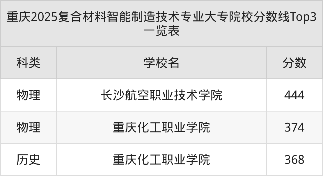 全国大专院校复合材料智能制造技术专业历史类最低收分为368分,对应的招生院校是重庆化工职业学院。