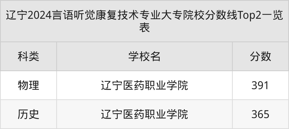 物理类最低收分为391分,对应的招生院校是辽宁医药职业学院。结合上述分析,历史类考生比物理类考生更容易上言语听觉康复技术大专院校。