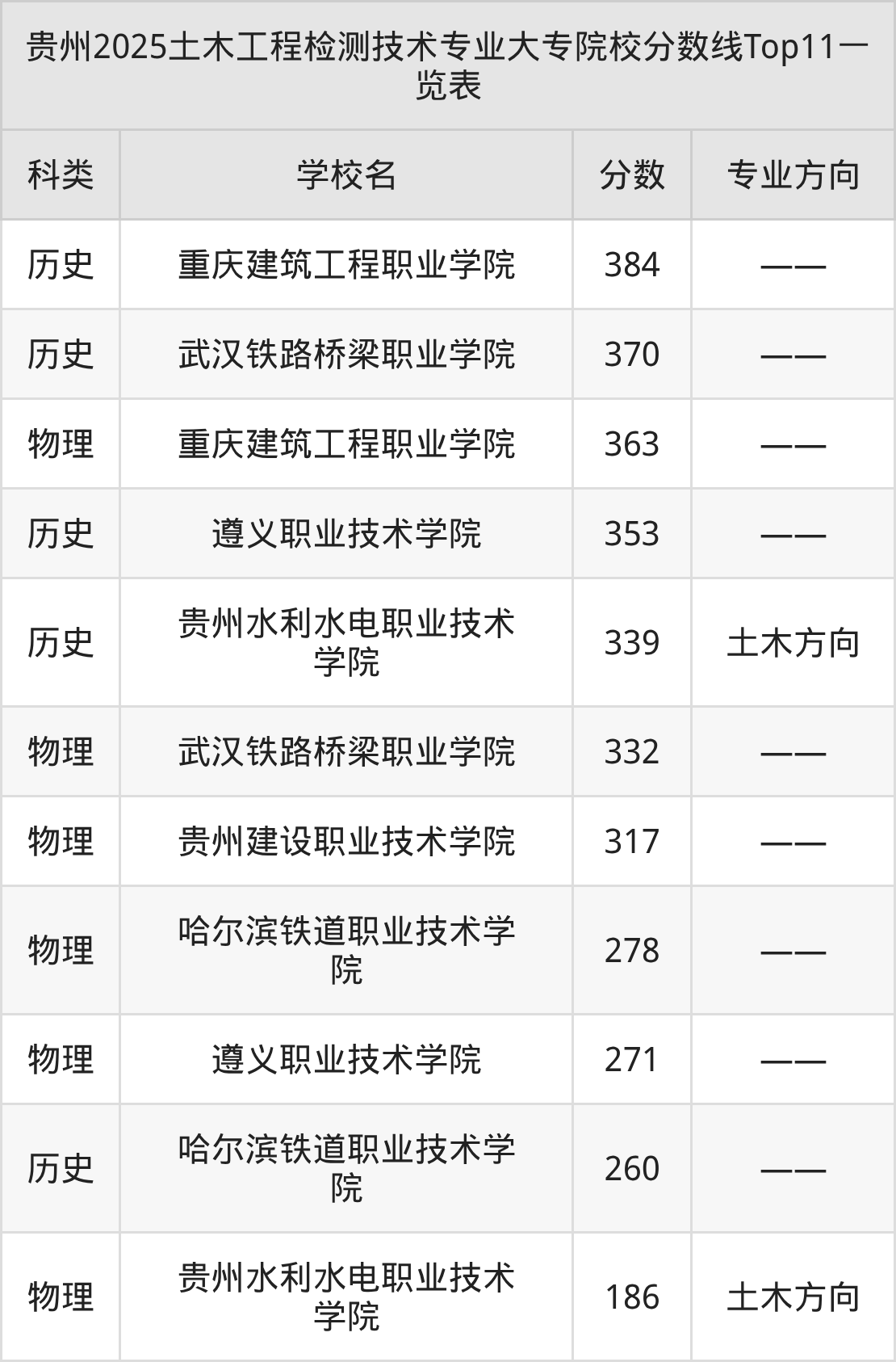 土木工程检测技术专业大专院校实力排名靠前的有陕西铁路工程职业技术学院、贵州交通职业大学、黄河水利职业技术学院等。2025年大专土木工程检测技术专业招生最低分数为186分(物理类),而想报考该专业的历史类考生分数至少要在260分以上。
