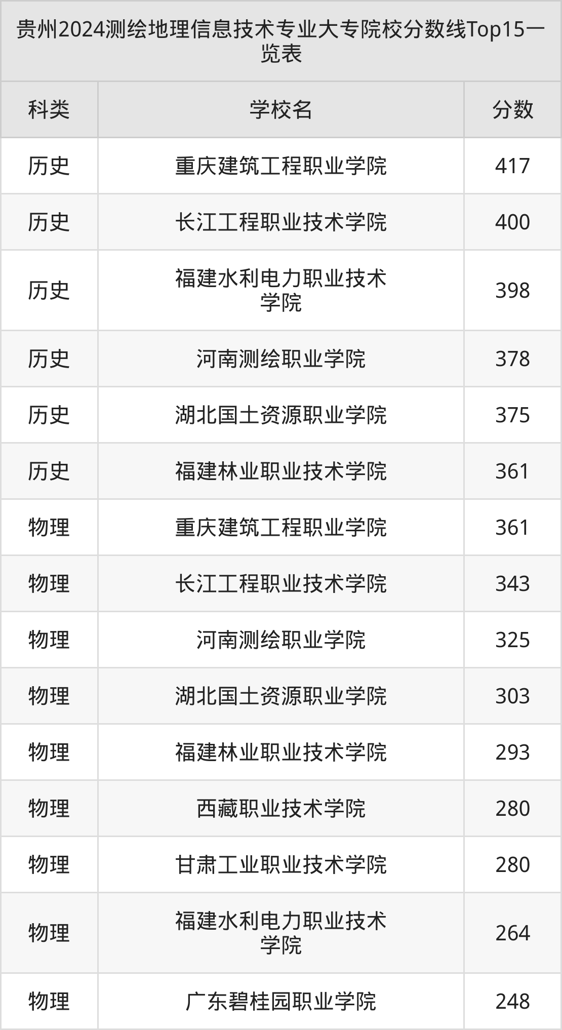物理类最低收分范围在248分~361分之间,其中最低分院校是广东碧桂园职业学院,最高分院校是重庆建筑工程职业学院。结合上述分析,物理类考生比历史类考生更容易上测绘地理信息技术大专院校。