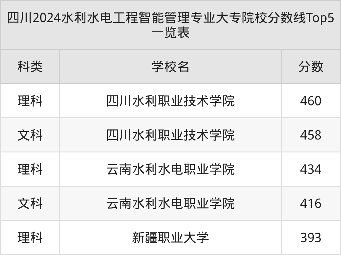 理科最低收分范围在393分~460分之间,其中最低分院校是新疆职业大学,最高分院校是四川水利职业技术学院。结合上述分析,理科考生比文科考生更容易上水利水电工程智能管理大专院校。