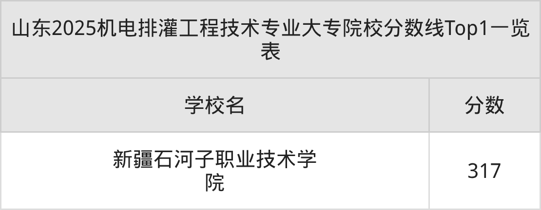 全国大专院校机电排灌工程技术专业最低收分为317分,对应的招生院校是新疆石河子职业技术学院。