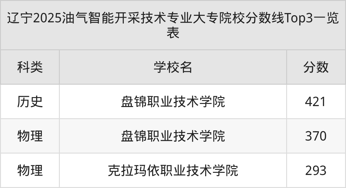 全国大专院校油气智能开采技术专业历史类最低收分为421分,对应的招生院校是盘锦职业技术学院。