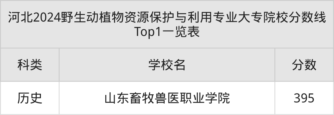 全国大专院校野生动植物资源保护与利用专业历史类最低收分为395分,对应的招生院校是山东畜牧兽医职业学院。