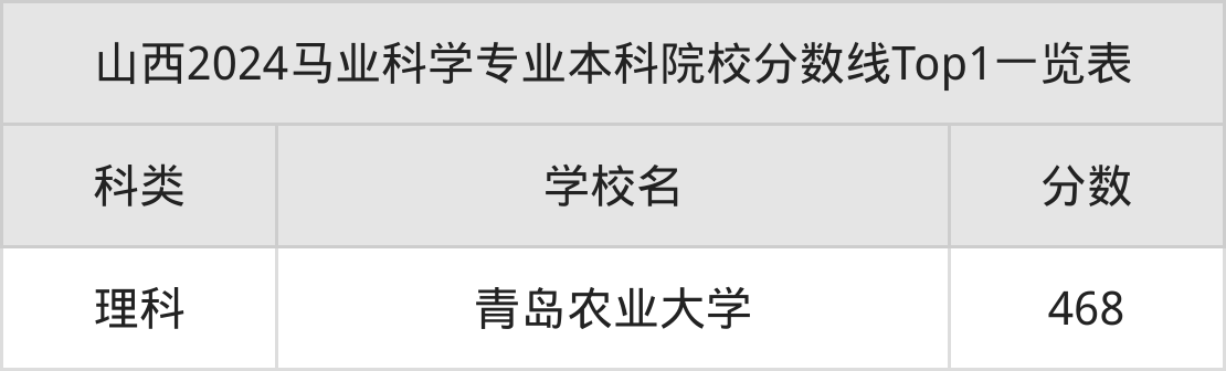 全国本科院校马业科学专业理科最低收分为468分,对应的招生院校是青岛农业大学。