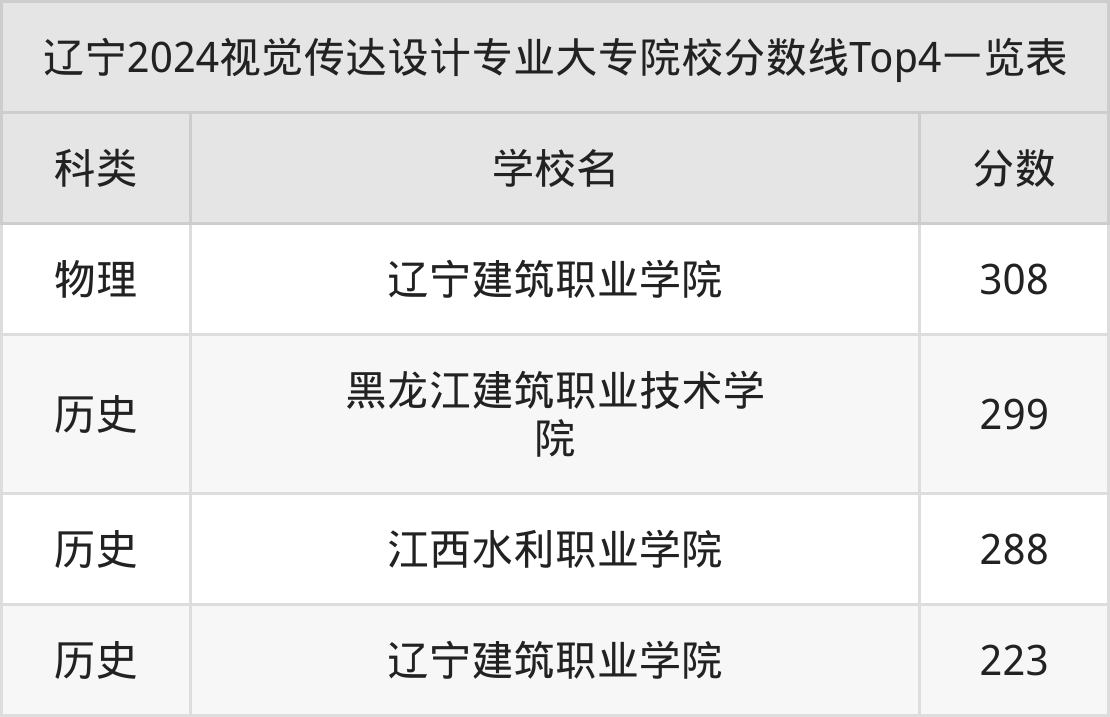 物理类最低收分为308分,对应的招生院校是辽宁建筑职业学院。结合上述分析,历史类考生比物理类考生更容易上视觉传达设计大专院校。