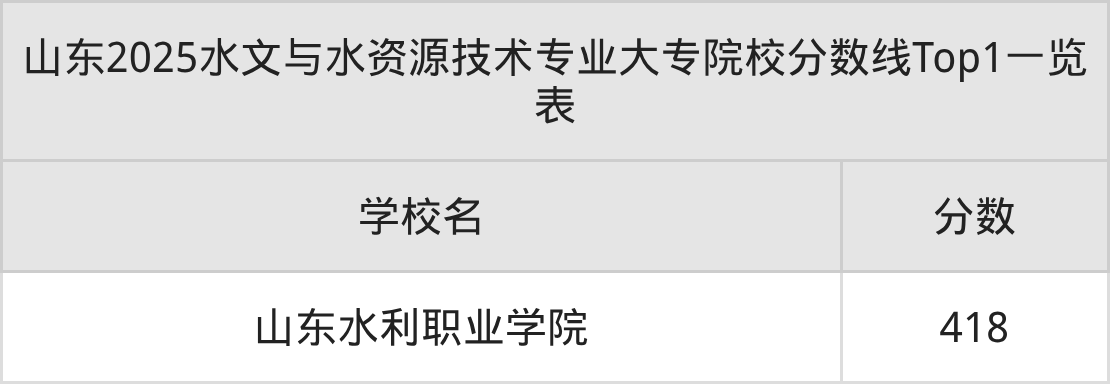全国大专院校水文与水资源技术专业最低收分为418分,对应的招生院校是山东水利职业学院。