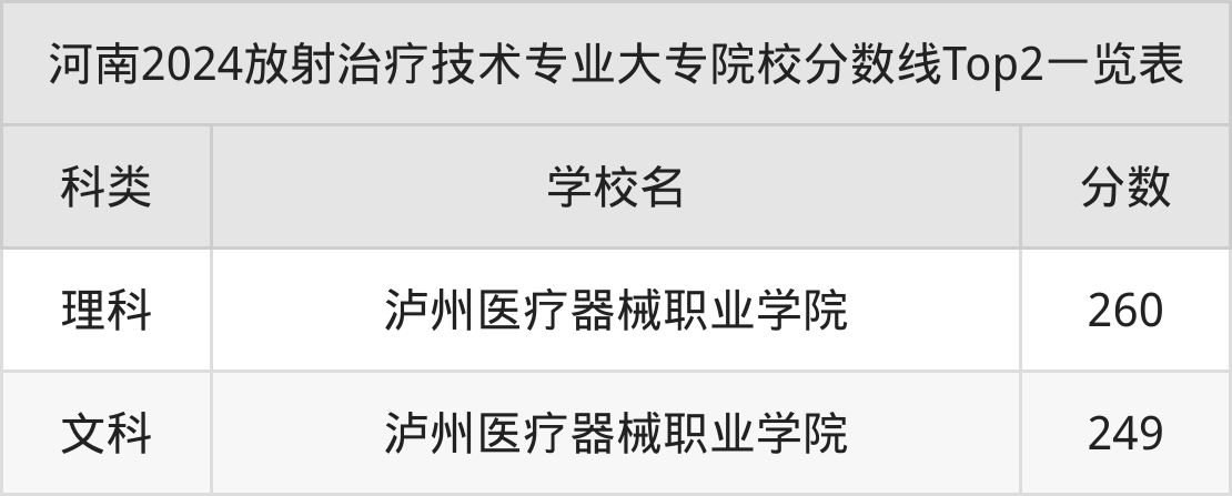 理科最低收分为260分,对应的招生院校是泸州医疗器械职业学院。结合上述分析,文科考生比理科考生更容易上放射治疗技术大专院校。