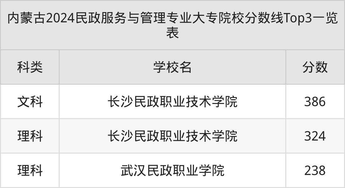 全国大专院校民政服务与管理专业文科最低收分为386分,对应的招生院校是长沙民政职业技术学院。