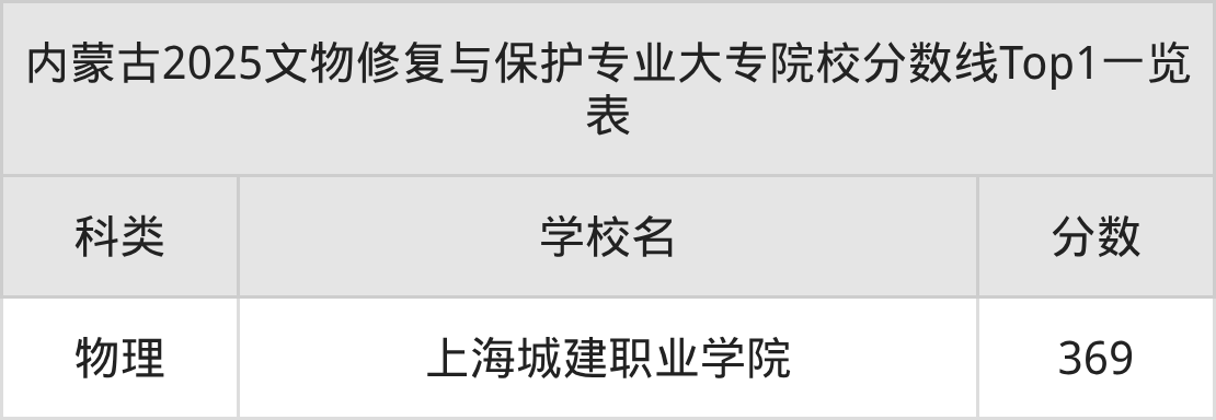 全国大专院校文物修复与保护专业物理类最低收分为369分,对应的招生院校是上海城建职业学院。