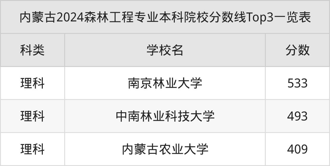 全国本科院校森林工程专业理科最低收分范围在409分~533分之间,考生最容易被录取的是内蒙古农业大学,分数门槛在二本线上49分。最难被录取的是南京林业大学,分数门槛在二本线上173分。