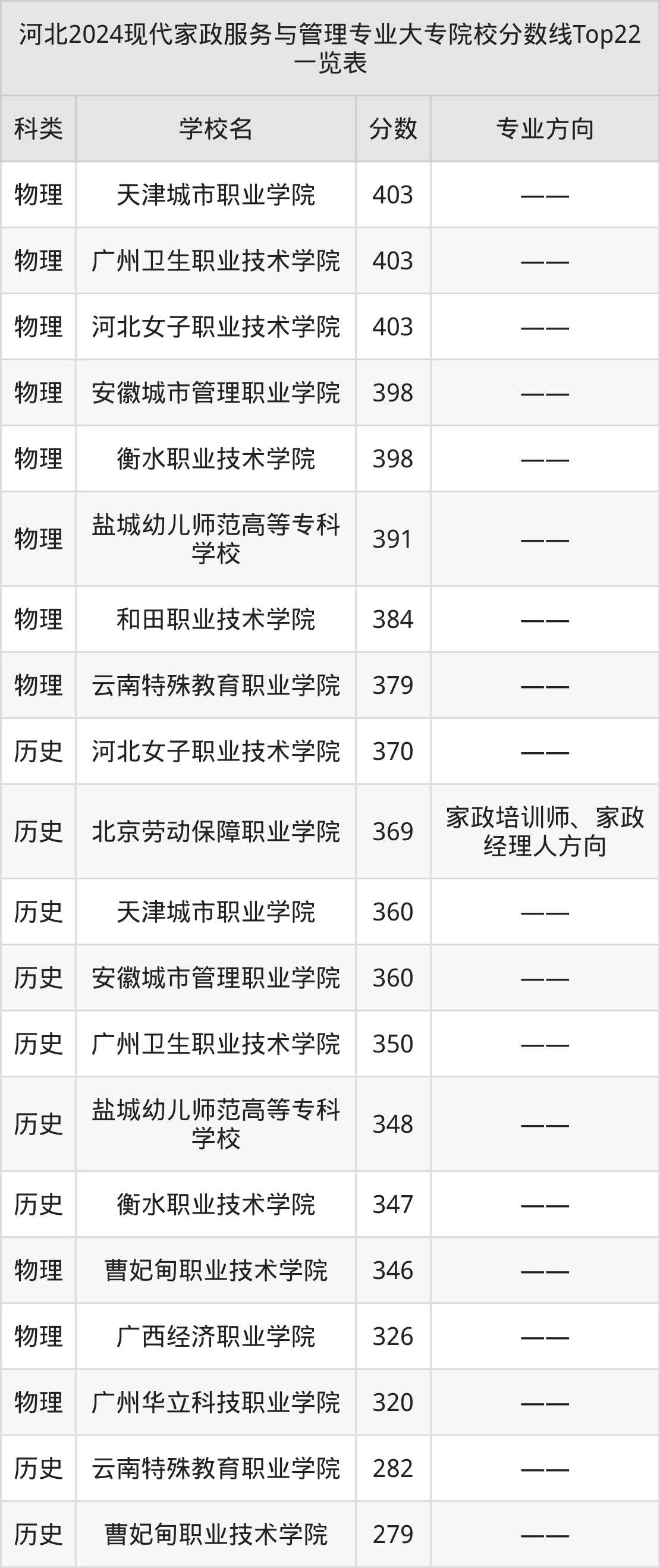 物理类最低收分范围在320分~403分之间,其中最低分院校是广州华立科技职业学院,最高分院校是天津城市职业学院。结合上述分析,历史类考生比物理类考生更容易上现代家政服务与管理大专院校。