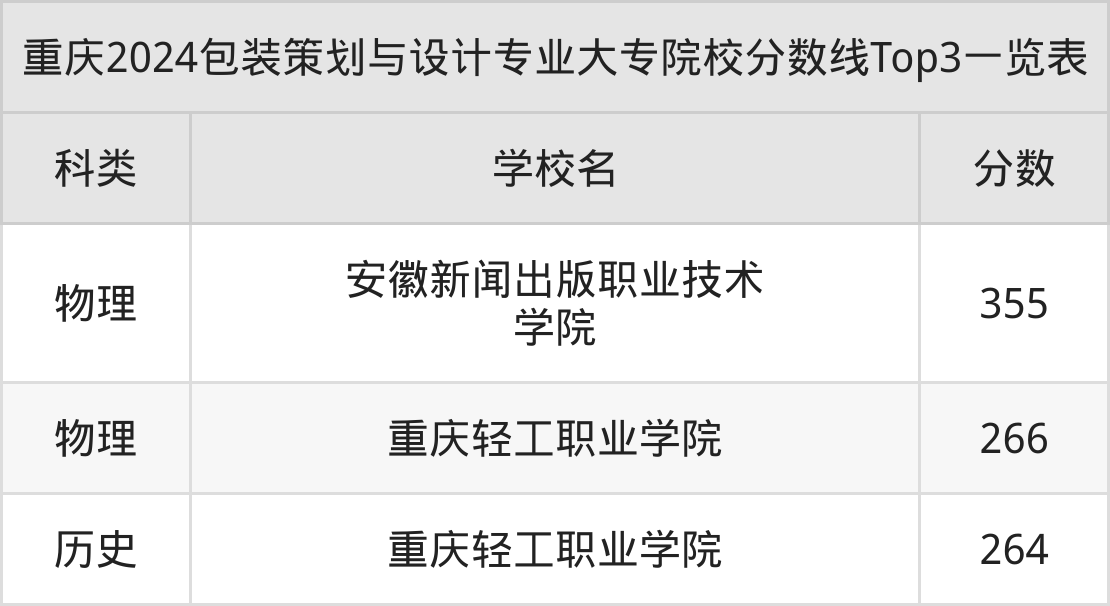 全国大专院校包装策划与设计专业历史类最低收分为264分,对应的招生院校是重庆轻工职业学院。