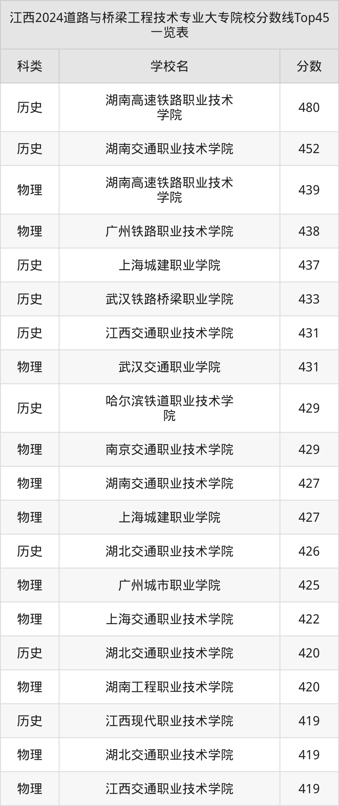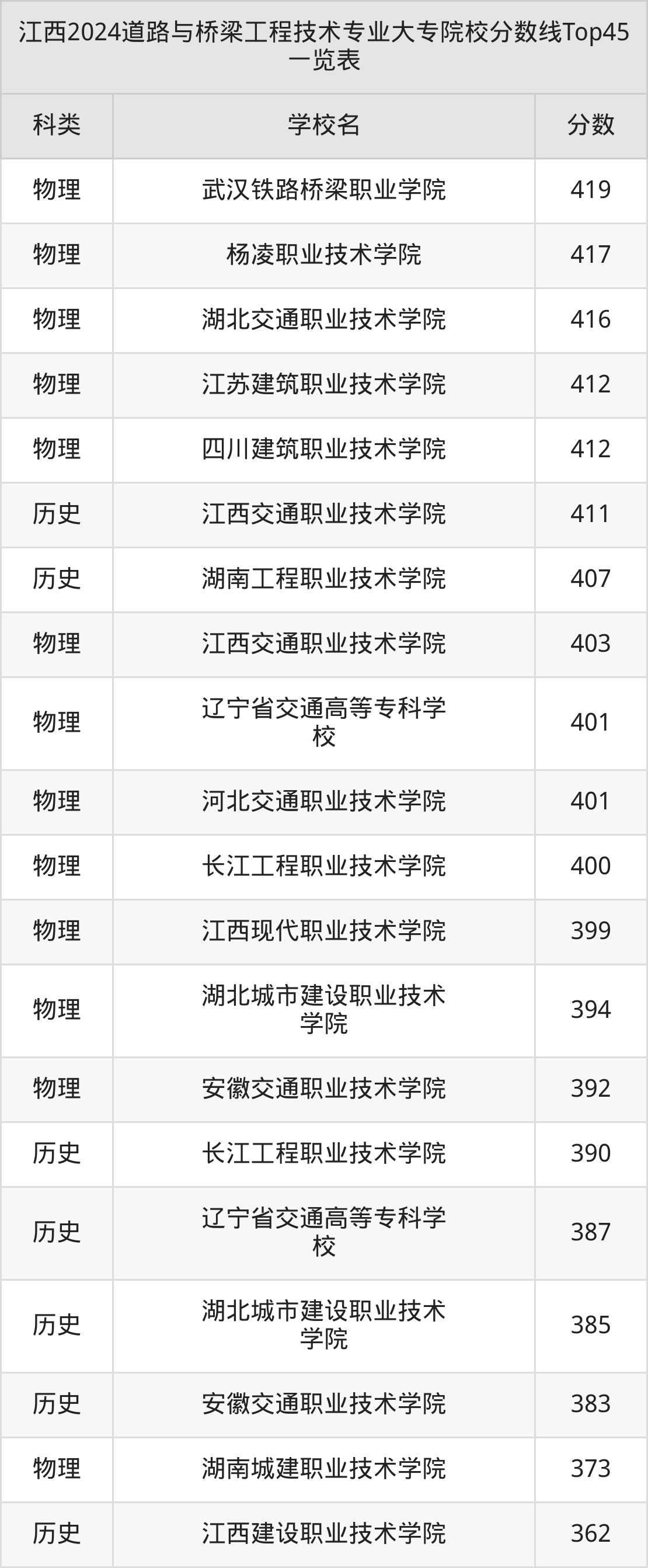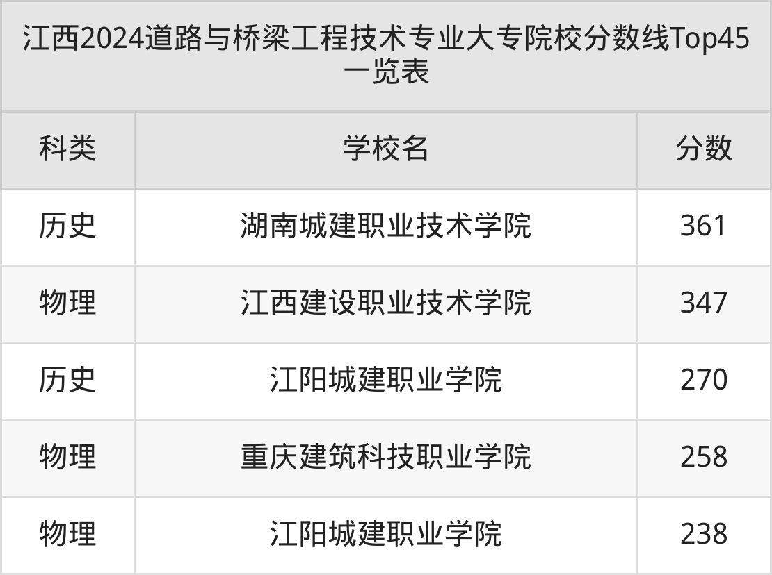 道路与桥梁工程技术专业大专院校实力排名靠前的有浙江交通职业技术学院、辽宁省交通高等专科学校、湖南交通职业技术学院等。2024年大专道路与桥梁工程技术专业招生最低分数为238分(物理类),而想报考该专业的历史类考生分数至少要在270分以上。