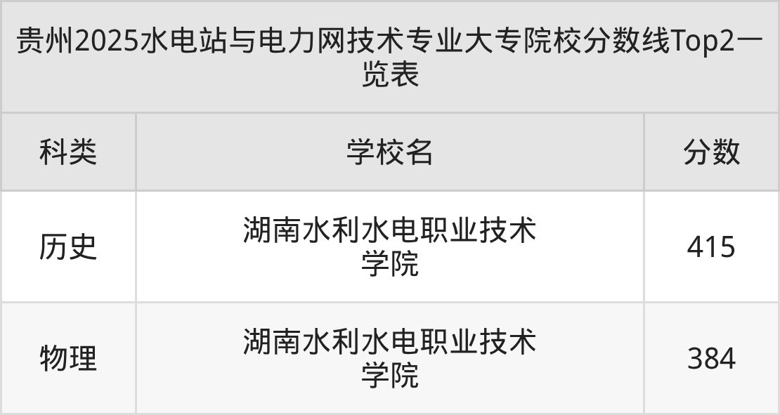 物理类最低收分为384分,对应的招生院校是湖南水利水电职业技术学院。结合上述分析,物理类考生比历史类考生更容易上水电站与电力网技术大专院校。